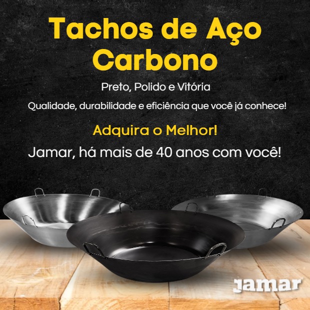 Os tachos e frigideiras de Aço Carbono, apresentam grande resistência e durabilidade sem deformar. Concentram e retém maior calor, com cozimento em menor tempo, o que significa menor consumo de gás ou lenha. Recomendado por ser um material saudável para cocção, devidamente temperado após adquirido, apresenta características antiaderente. Oferecemos nossos Tachos em Chapa Bruta, Chapa Polida e Chapa Preta. Com Aba Alta ou Baixa (estilo paellera). São perfeitos para cozinhar, fritar e servir: carnes, peixes, aves, legumes, risotos, farofas, paellas, etc.